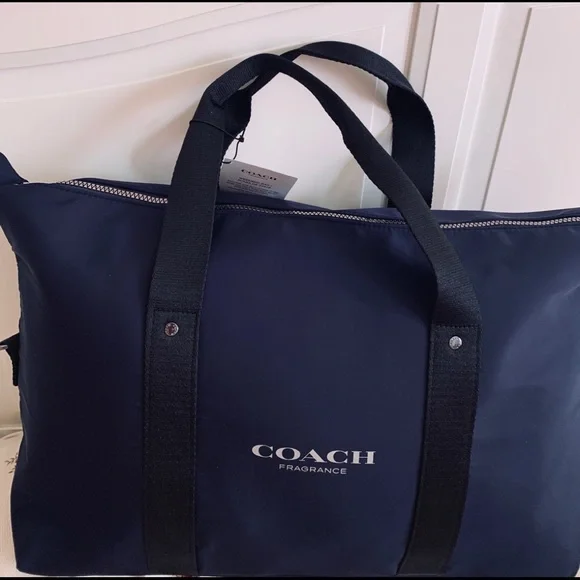 Brand new and Authentic Dark Navy coach Duffel BagHas black strap . Carry on handle and adjustable strap included .Approximate measurements are 23”x 14x7”Got zipper on the topSpacious and easy to carry.Perfect for gym and travelling.Great qualityMade exclusively by coach fragrance that’s mentioned on the Duffel bag .