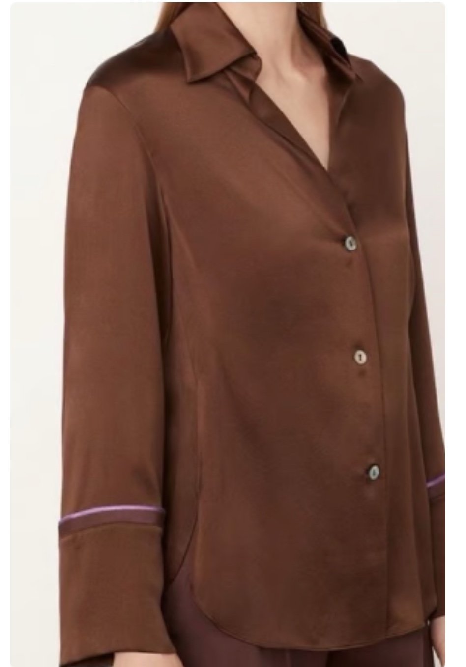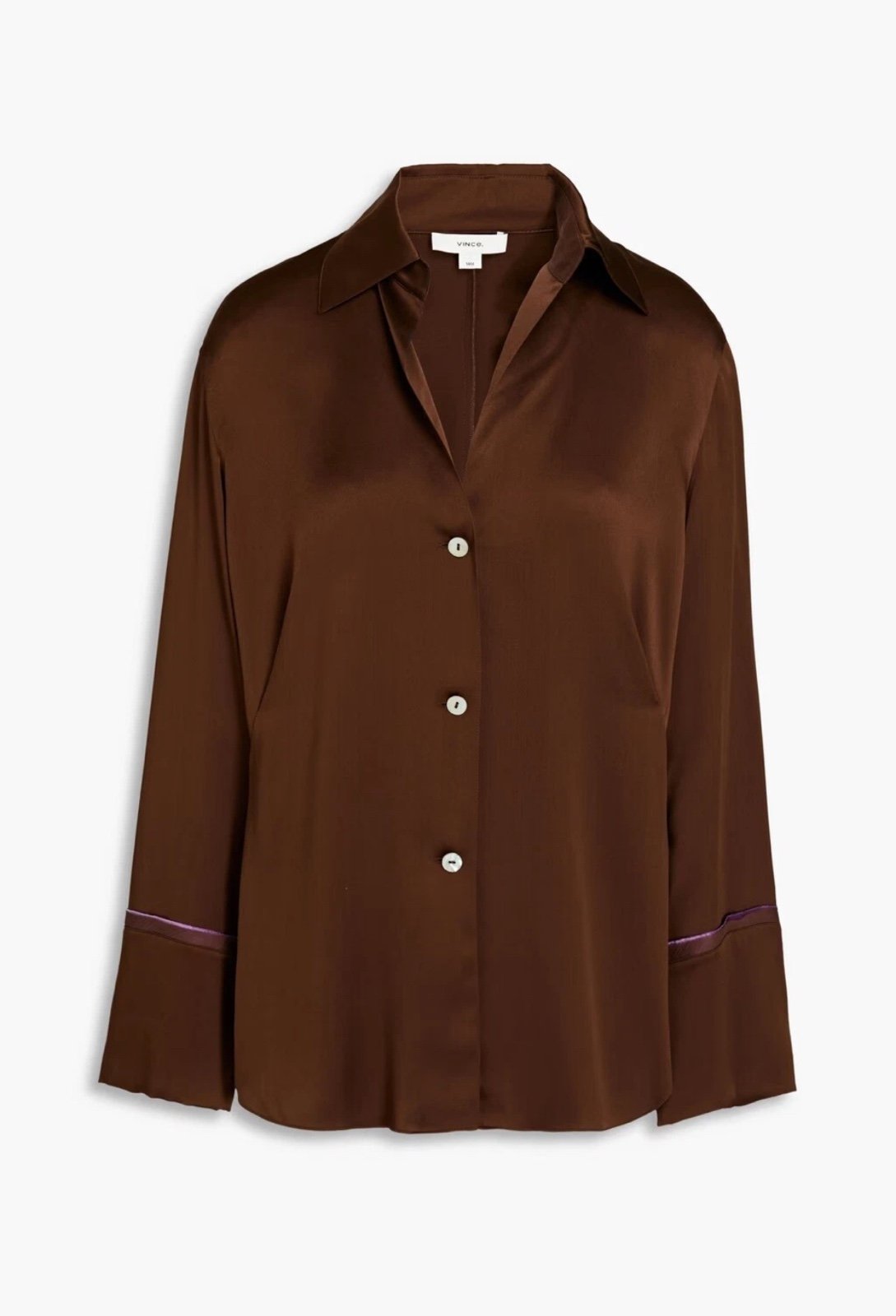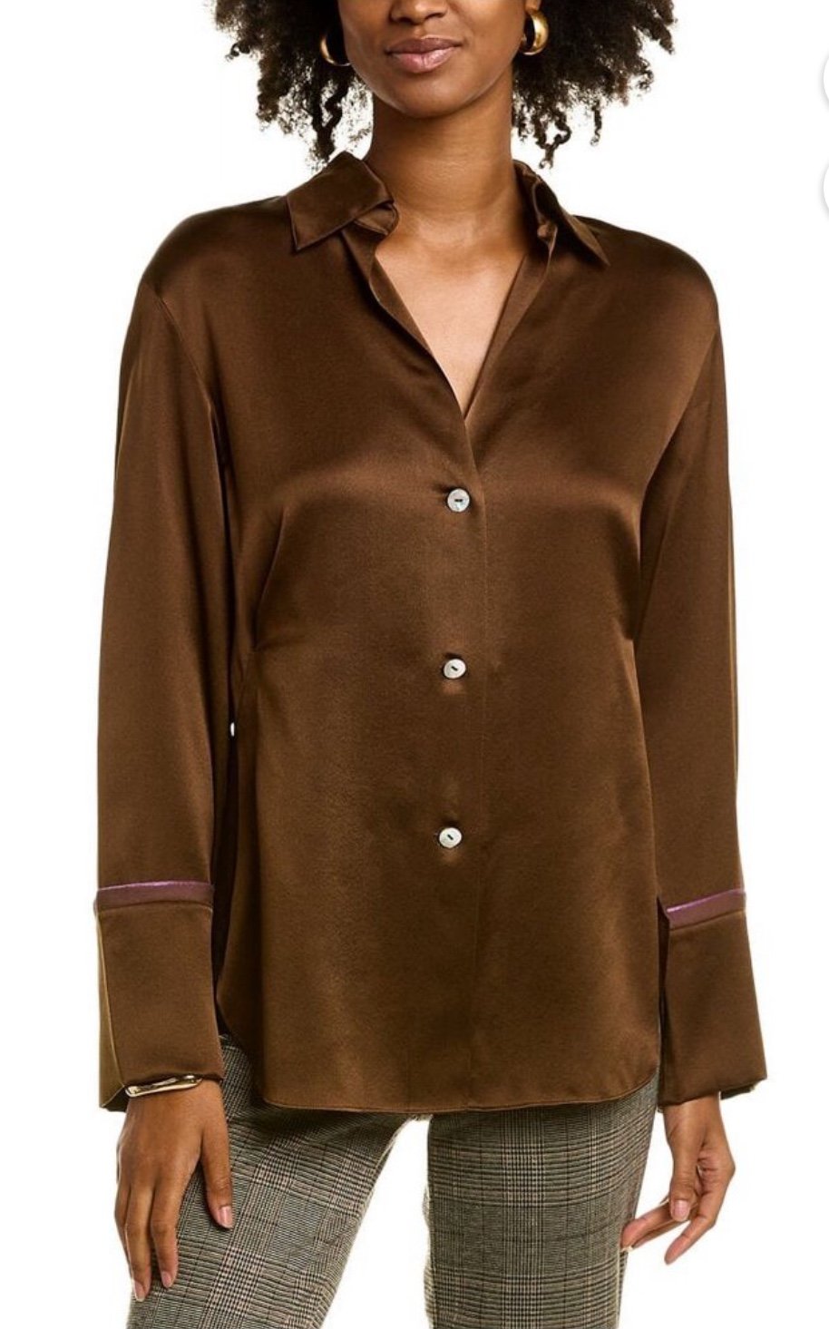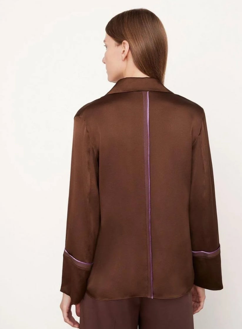 Vince Silk Tipped Long Sleeve Blouse. Thoughtful, considered details elevate Vince's pajama-style blouse. Cut from lustrous silk-satin, it's darted for shape and traced with raw-edged purple trims along the cuffs and back seam that beautifully contrasts the rich 'Clove' hue. Slip yours on over a slip skirt and feel luxurious.