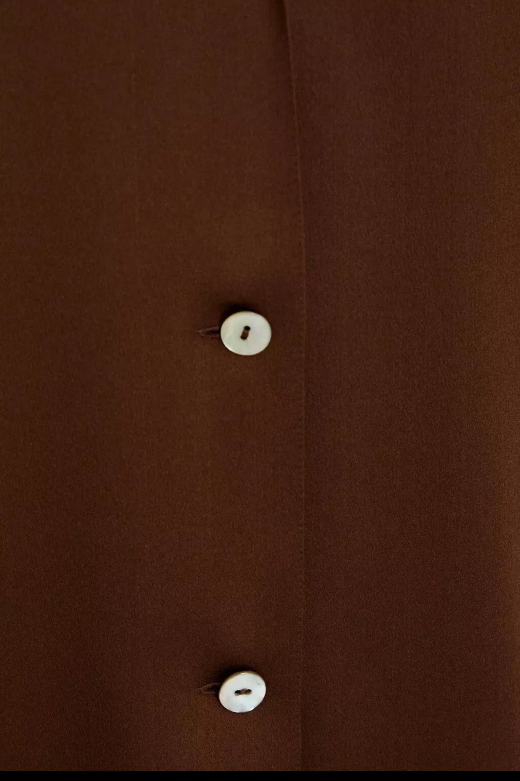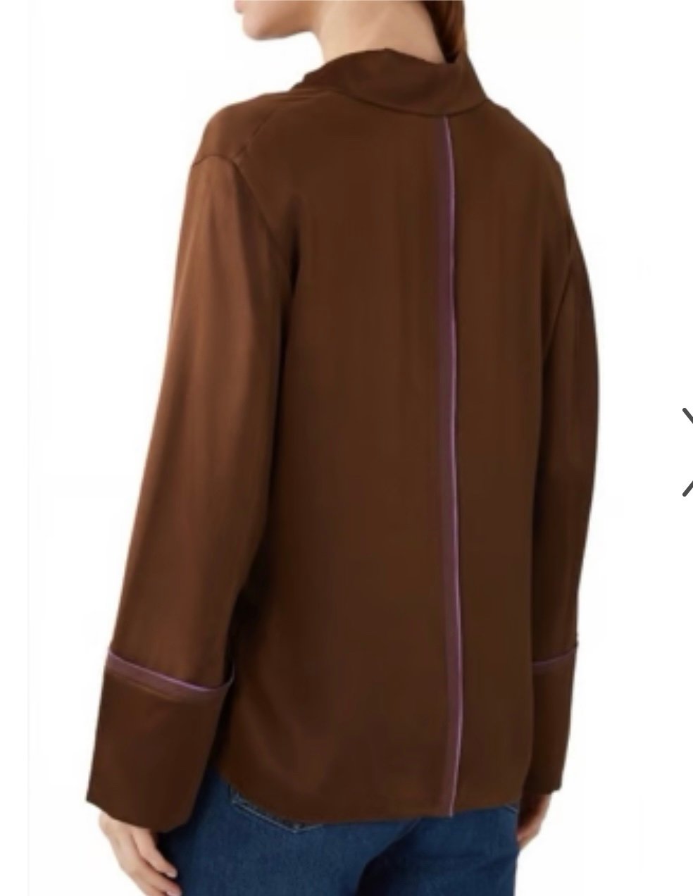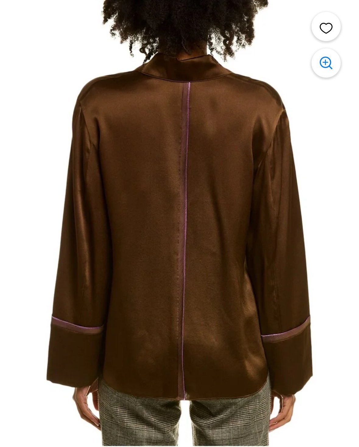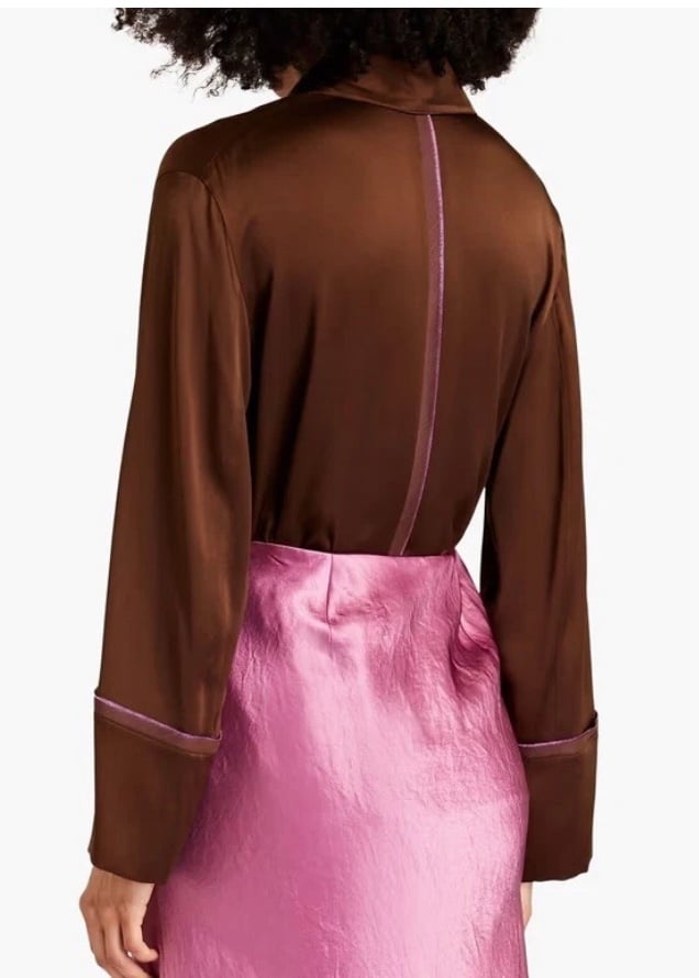 Vince Silk Tipped Long Sleeve Blouse. Thoughtful, considered details elevate Vince's pajama-style blouse. Cut from lustrous silk-satin, it's darted for shape and traced with raw-edged purple trims along the cuffs and back seam that beautifully contrasts the rich 'Clove' hue. Slip yours on over a slip skirt and feel luxurious.